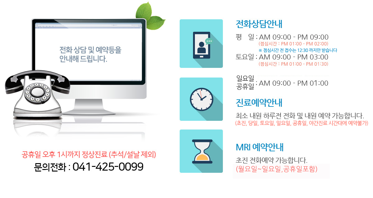 • 토요일 : 09:00 - 15:00※ 일요일, 공휴일은 휴진