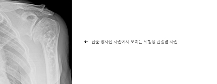 동통과 운동제한을 가진 환제에서 엑스레이 소견을 보면 알 수 있습니다. 엑스레이에서는 관절 간격이 줄어들고 골극이라는 비정상 뼈 만들어져 있으며 관절면이 불규칙하고 딱딱하게 경화된 특징을 보입니다. CT를 통해 관절면 변형 및 관절와 골결손을 정확하게 파악할 수 있기도 합니다.