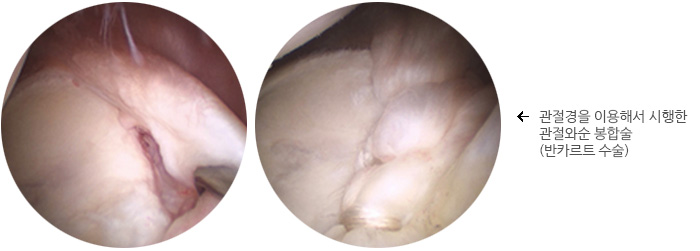 반복적인 견관절의 전방 탈구 등이 지속될 때에는 수술적 치료가 필요합니다. 수술적 치료의 방법은 관절이 탈구될 때 발생한 관절와순을 봉합하는 수술을 시행할 수 있으며 (일명 “반카르트 수술”) 과거에는 관절을 열어 노출 시킨 후에 봉합하는 방법을 많이 이용하였으나 현재는 대부분 관절경을 이용하여 복원술을 시행하며 이로 인해 회복이 빠르고 수술 시 발생할 수 있는 관절손상의 가능성이 줄었습니다. 골 결손이 심한 경우에는 이에 대해 골 이식 등의 치료법을 이용할 수 있습니다.