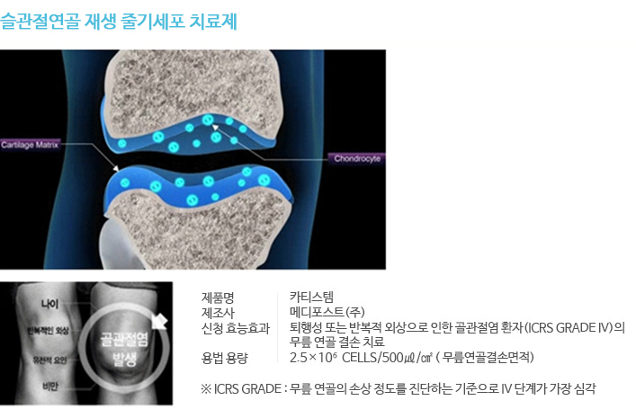 위 고시에 따라 카티스템은 한국식품의약품안전청(KFDA)의 GMP(Good Manufacturing Practice)기준에 따라 체외에서 분리 배양된 순수한 중간엽줄기세포 치료제로, KFDA의 의약품 임상시험 관리기준(GCP)에 의해 임상시험을 진행하여 인체의 안전성 및 유효성을 확인하여 2012년 1월 KFDA로부터 품목허가승인 받은 전문의약품입니다. 비맥 (B-MAC) 또한 한국식품의약품안전처(KFDA) 승인 후 최근 다양하게 임상 활용되고 있습니다. 또한, 최근 Artifilm, Hyalofast, Cartifill 등의 제품이 임상 사용이 허가되어 사용되고 있습니다.