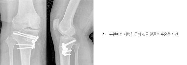 무릎 관절염은 한 구획을 침범하는 경우가 많으며 대부분 내측입니다. 이런 경우 하지의 정열을 재조정함으로써 체중부하를 아프지 않은 쪽으로 옮겨서 동통을 줄이는 방법으로 근위 경골 절골술이 있습니다.